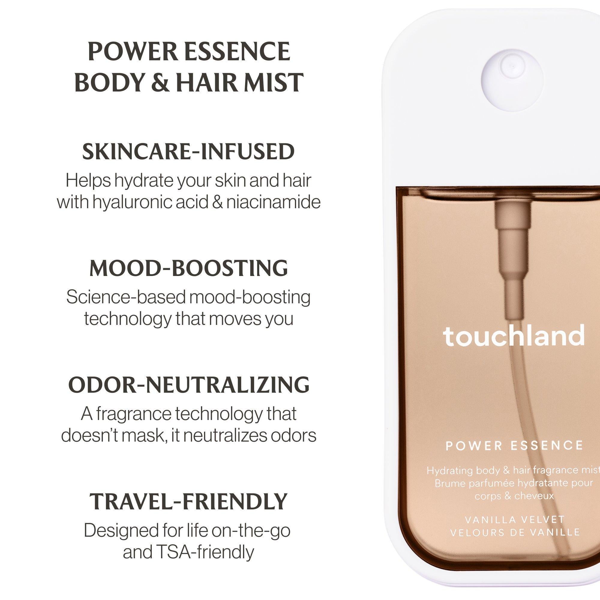 Touchland's Whipped Bliss Limited Edition Body & Hand Mist Essentials Set features the indulgent Vanilla Velvet Body & Hair Fragrance Mist and the lush Berry Bliss Hydrating Hand Sanitizer, an everyday essentials duo designed to move you and move with you.